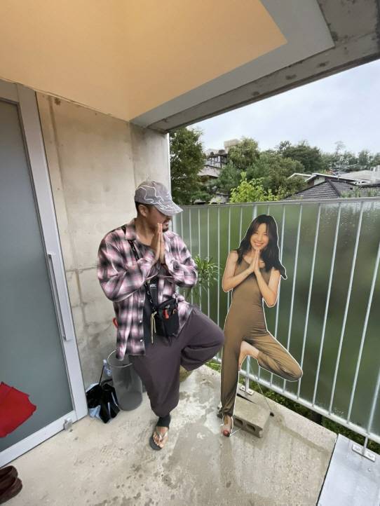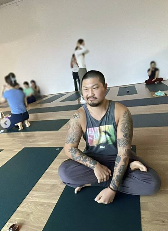 공개된 사진에는 던밀스가 이효리가 운영 중인 연희동 요가원에서 포즈를 취한 모습이 담겼다. 민소매 차림으로 팔 문신을 드러낸 그는 이효리의 등신대 옆에서 인증샷을 남기며 "요가천재"다운 자신감을 뽐냈다.