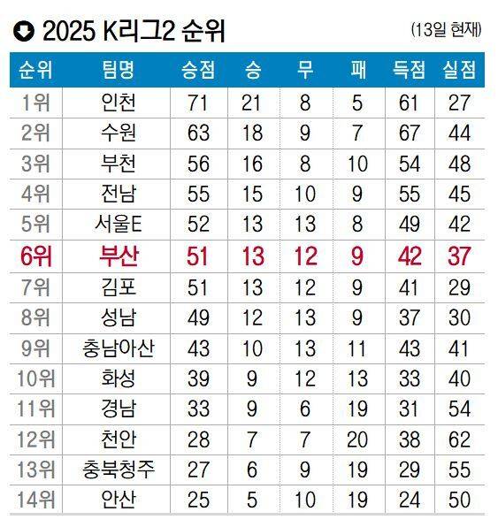 부산은 13일 현재 13승12무9패(승점 51)로 리그 6위에 머물러 있다. 1부 리그 승격을 위한 플레이오프(PO) 진출권(1~5위)에서 벗어났다.