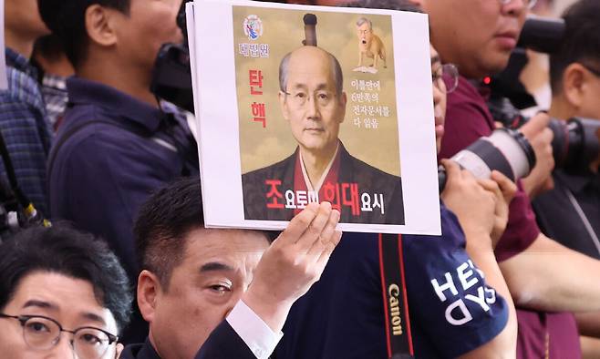 | ‘조요토미 희대요시’ 합성 팻말 논란 무소속 최혁진 의원이 13일 서울 여의도 국회에서 열린 법사위 국정감사에서 조희대 대법원장과 조선시대 임진왜란을 일으킨 일본 도요토미 히데요시를 합성한 사진을 들어보이고 있다. 허정호 선임기자 |