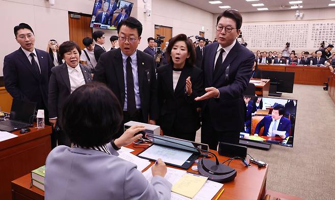 | 추 위원장에 항의하는 野 국회 법제사법위원회 소속 나경원 의원 등 국민의힘 의원들이 13일 서울 여의도 국회에서 열린 대법원 등에 대한 국정감사에서 조희대 대법원장 질의응답과 관련한 진행 문제로 추미애 법사위원장에게 항의하고 있다. 왼쪽부터 박준태 의원, 조배숙 의원, 곽규택 의원, 나 의원, 신동욱 의원. 허정호 선임기자 |