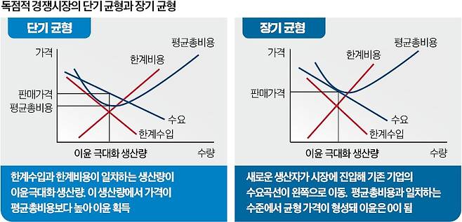 독점적 경쟁은 독점과는 다르다. 독점적 경쟁시장은 독점시장과 달리 진입 장벽이 높지 않다. 또한 완전히 똑같지는 않더라도 대체재가 될 상품이 다수 존재한다. 이 때문에 독점적 경쟁시장 내 생산자의 독점력은 아주 제한된 범위에 그친다. 단골을 많이 만들어 놨더라도 길 건너편에 비슷한 가게가 생기면 시장을 나눠 가질 수밖에 없다. 이런 이유로 경제학 교과서에선 독점적 경쟁시장의 장기 이윤이 0이 된다고 설명한다. 물론 여기서 이윤은 기회비용을 포함한 경제학적 이윤이다. 경제학적 이윤이 0이더라도 기회비용을 제외할 경우 회계학적 이윤을 얻는 것은 가능하다.