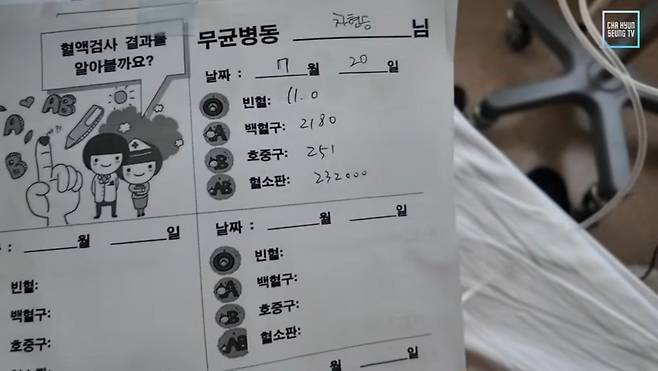 아침 식사를 마친 뒤 약을 기다리던 차현승은 불편한 듯 손가락을 살폈다. 그는 손가락을 보여 주며 "이렇게 피부가 계속 벗겨졌다가 나았다가 그런다"고 설명했다. 이어 혈액 검사 기록지를 공개하면서 "호중구(백혈구의 한 종류)가 올라야 하는데 계속 안 잡힌다. 1000 이상은 올라야 하는데"라며 걱정했다. 기록지에 적힌 호중구 수치는 250대였다.