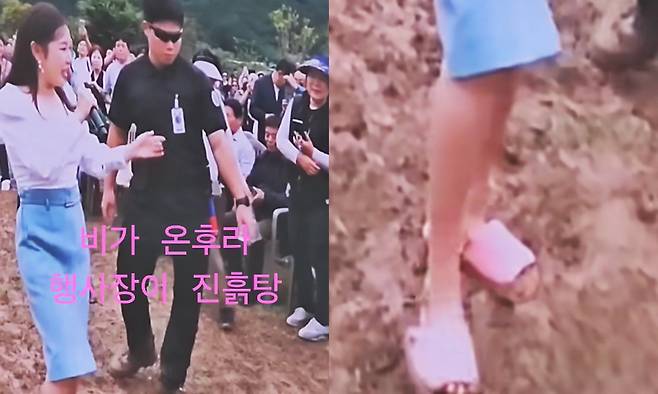 지난 12일 경기도 포천시에서 열린 한 지역 행사에 참석한 송가인은 폭우로 인해 진흙탕이 된 바닥에서도 밝은 미소와 에너지로 공연을 이어갔다.