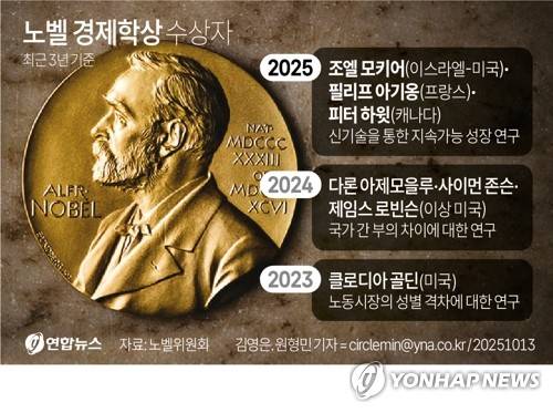 (서울=연합뉴스) 김영은 원형민 기자 = 스웨덴 왕립과학원은 조엘 모키어(79), 필리프 아기옹(69), 피터 하윗(79) 등 3인에게 노벨경제학상을 수여하기로 했다고 13일(현지시간) 밝혔다.