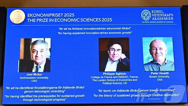 (왼쪽부터) 조엘 모키르 미국 노스웨스턴 대학 교수, 필립 아기옹 프랑스 인시아드 및 영국 런던 정치경제대학교 교수, 피터 호위트 미국 브라운 대학 교수가 노벨경제학상을 수상했다. ⓒ AFP=뉴스1