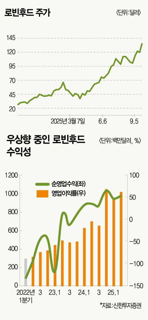 올해만 200% 넘게 주가 상승한 종목이 있다. 금융 거래 플랫폼 로빈후드다. 1월 2일 39달러였던 주가는 10월 1일 139달러까지 올랐다. 256% 상승이다. 당초 가상자산·주식 거래 플랫폼에 그쳤다면 최근 이자 수익을 늘리고 카드·자산관리 역량을 종합한 ‘금융 슈퍼앱’으로 자리 잡은 모습이다. 전문가들은 당분간 상승세 지속을 점친다. 최근 스탠더드앤드푸어스(S&P)500에도 편입된 만큼 패시브 자금 유입이 가능해져서다.