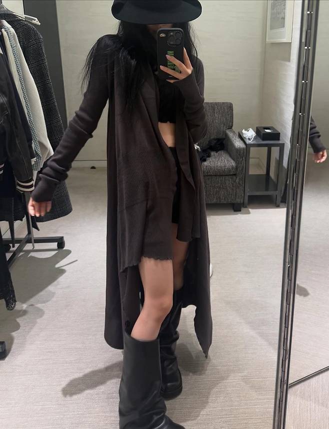 마지막 컷에서는 롱 가디건과 블랙 부츠, 챙이 넓은 버킷햇을 매치해 미러 샷으로 시크한 분위기를 완성했다.