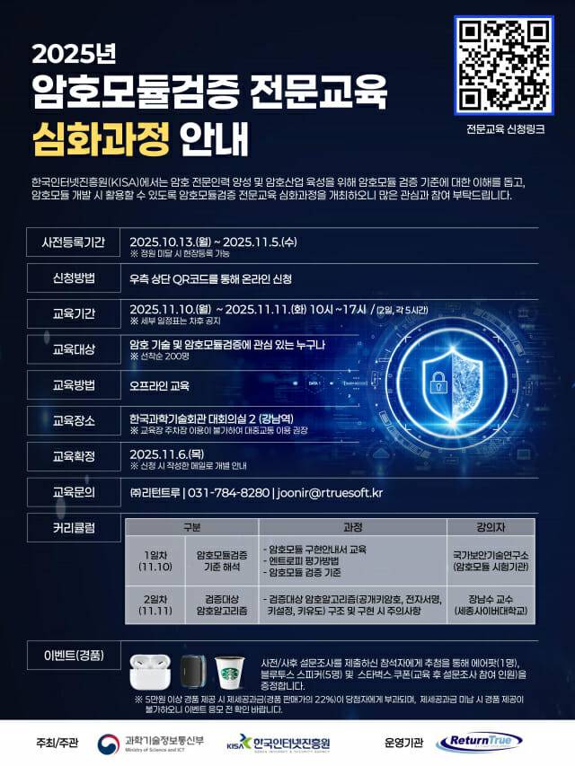 한국인터넷진흥원(원장 이상중, KISA)은 암호 인력 양성 및 암호산업 육성을 위한 '2025 암호모듈검증 전문교육' 심화 과정 교육생을 다음달 5일(수)까지 모집한다고 13일 밝혔다.