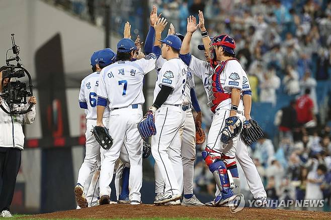(대구=연합뉴스) 김성민 기자 = 13일 대구 삼성라이온즈파크에서 열린 2025 KBO 프로야구 포스트시즌 준플레이오프 3차전 SSG 랜더스와 삼성 라이온즈의 경기. 5 대 3로 승리한 삼성 선수들이 기뻐하고 있다. 2025.10.13