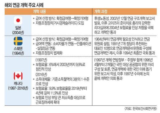 한국은 지난 3월 국민연금법 개정안을 통과시키며 보험료율과 소득대체율을 조정하는 모수 개혁을 실시했다. 하지만 근본적인 구조개혁까지는 갈 길이 멀다는 평가다. 한국보다 먼저 연금개혁을 시도한 해외 주요 국가들도 적정 연금 수급 연령에 대해 고민하는 등 보장성과 지속가능성 사이에서 고민을 거듭하고 있다.