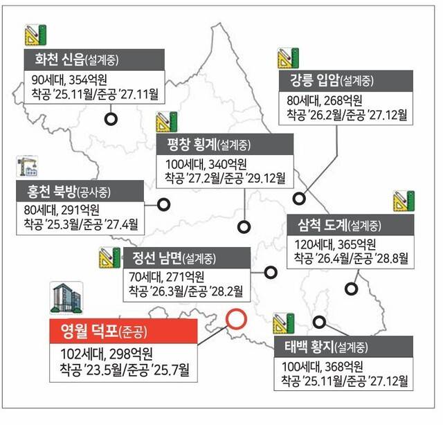 이 밖에 2호 사업인 홍천 북방지구 공공주택은 지난 3월 착공해 2027년 4월 준공을 목표로 순항 중이다. 나머지 6곳 사업은 설계가 진행 중인 가운데, 이 중 화천 신읍지구와 태백 황지지구가 오는 11월 착공을 앞뒀다.