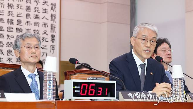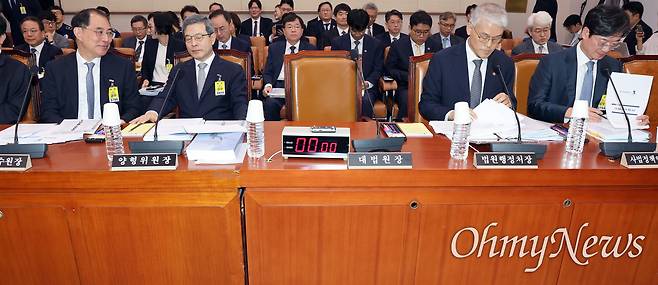 | ▲ 천대엽 법원행정처장이 13일 서울 여의도 국회에서 열린 법제사법위원회 국정감사에서 의원 질의에 답변하고 있다. 왼쪽은 조희대 대법원장. |