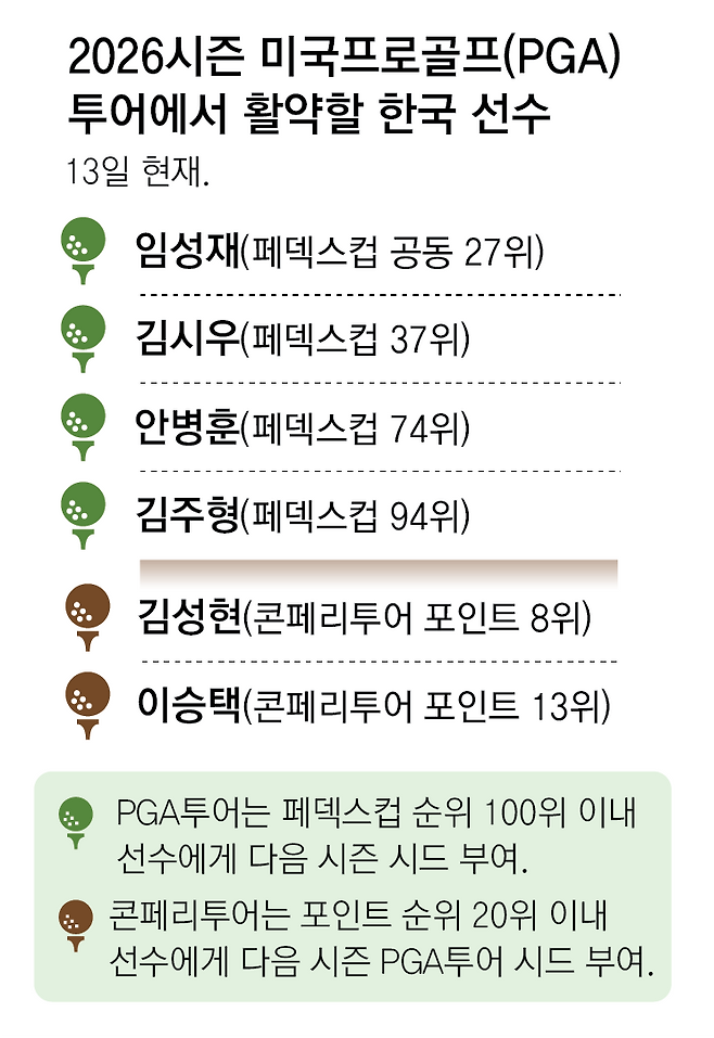 이승택은 13일 미국 인디애나주 프렌치릭 리조트(파72)에서 열린 콘페리(2부)투어 최종전 콘페리투어 챔피언십에서 공동 24위(2언더파 286타)로 대회를 마쳤다. 콘페리투어 포인트 36.83점을 추가하며 총점 1133.85점을 기록한 이승택은 13위에 자리하며 2026시즌 PGA투어 진출을 확정지었다. 이승택은 “어린 시절부터 키워 온 오랜 꿈을 이뤘다. 말로 표현할 수 없을 만큼 가슴이 뛴다”고 벅찬 소감을 밝혔다.