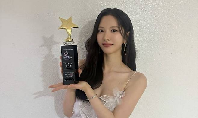 공개된 사진에는 코리아 드라마 어워즈에 참석해 여자 우수연기상을 수상한 김지연이 트로피를 들고 활짝 웃고 있는 모습이 담겨있었다. 김지연은 화려한 꽃 자수가 수놓인 순백의 드레스를 착용하고 우아함과 세련미를 함께 보여줬다. 우주소녀의 유연정과 다영은 "축하해, 멋있어"등의 댓글로 멤버 김지연을 응원하고 축하했다.