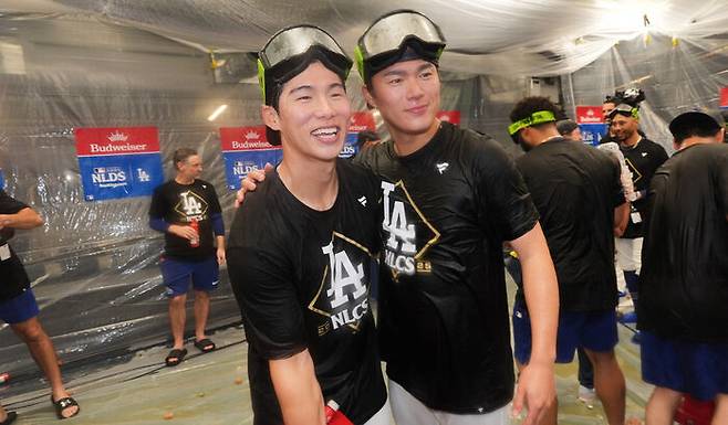 ▲ 팀 동료 야마모토(오른쪽)와 함께 리그 챔피언십 진출을 자축하는 김혜성