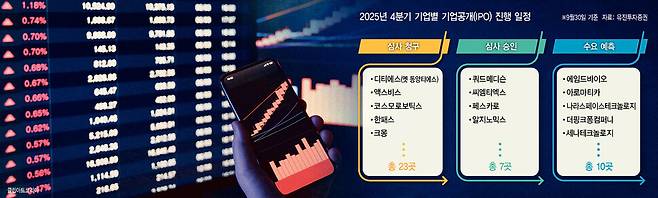 4분기에는 신규 제도 도입의 불확실성 때문에 상장 추진 일정을 미뤄왔던 기업들이 본격적으로 움직일 것으로 보인다. 공식적인 대어급 기업의 상장 일정은 발표된 게 없지만, 중견급 기업의 기업공개가 증가할 것이란 게 시장의 관측이다. 4분기 신규 상장 후보군 중에서는 ‘아기상어’와 ‘베베핀’ 등의 지식재산권(IP)을 보유한 더핑크퐁컴퍼니의 발걸음이 빠르다. 이 업체는 코스닥 상장을 위해 지난달 22일 금융위원회에 증권신고서를 제출했고 연내 상장을 목표로 하고 있다. 온디바이스 인공지능 솔루션업체 노타, 첨단과학 응용산업 전문기업 비츠로넥스텍 등은 10월 수요예측을 앞두고 있다. 디티에스(옛 동양티에스)와 세미파이브 등 준대어급 기업들도 심사 청구를 하고 승인을 기다리고 있다. 3분기 말 기준 기업공개 심사 청구를 한 기업은 디티에스 등 23곳, 심사 승인이 난 기업은 쿼드메디슨 등 7곳, 수요 예측이 예정된 기업은 에임드바이오 등 10곳이다. 수요 예측 예정 기업들의 공모 일정은 10월 말~11월 중순 사이에 몰려 있다.