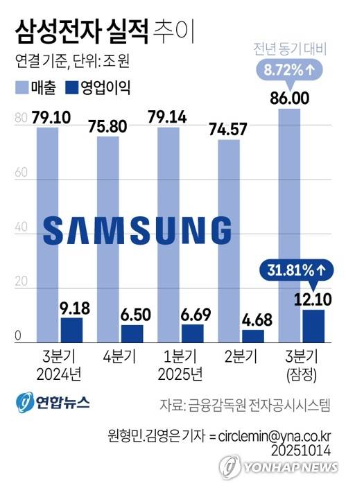 삼성전자는 연결 기준 올해 3분기 영업이익이 12조1천억원으로 지난해 동기보다 31.81% 증가한 것으로 잠정 집계됐다고 14일 공시했다.