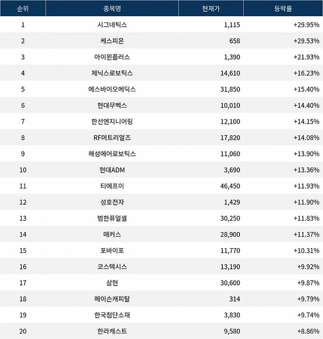 6위 현대무벡스(319400)는 현재가 10,010원으로 14.40% 급등 중이다. 7위 한선엔지니어링(452280)은 현재가 12,100원으로 14.15% 급등 중이다. 8위 RF머트리얼즈(327260)는 현재가 17,820원으로 14.08% 급등 중이다. 9위 해성에어로보틱스(059270)는 현재가 11,060원으로 13.90% 급등 중이다. 10위 현대ADM(187660)은 현재가 3,690원으로 13.36% 급등 중이다.