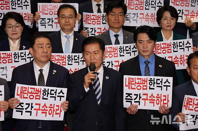 [서울=뉴시스] 김명년 기자 = 정청래 더불어민주당 대표가 14일 오전 서울 여의도 국회 로텐더홀에서 한덕수 전 국무총리 등 국무위원 내란 공모 기자회견을 열고 발언하고 있다. 2025.10.14. kmn@newsis.com