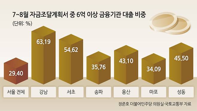 14일 헤럴드경제가 정준호 더불어민주당 의원실을 통해 제출받은 ‘1~8월 서울 주택 매매 자금조달계획서’ 자료를 분석한 결과, 금융기관 대출액이 있는 거래는 총 4만9809건 중 3만1731건(63%)로 집계됐다. 이 중 6·27 대책 이후 7~8월 두 달간 금융기관 대출이 있는 거래 건수는 총 4470건이었는데, 6억원 이상 금융기관 대출을 받은 건수는 1315건으로 전체의 29%에 달했다.