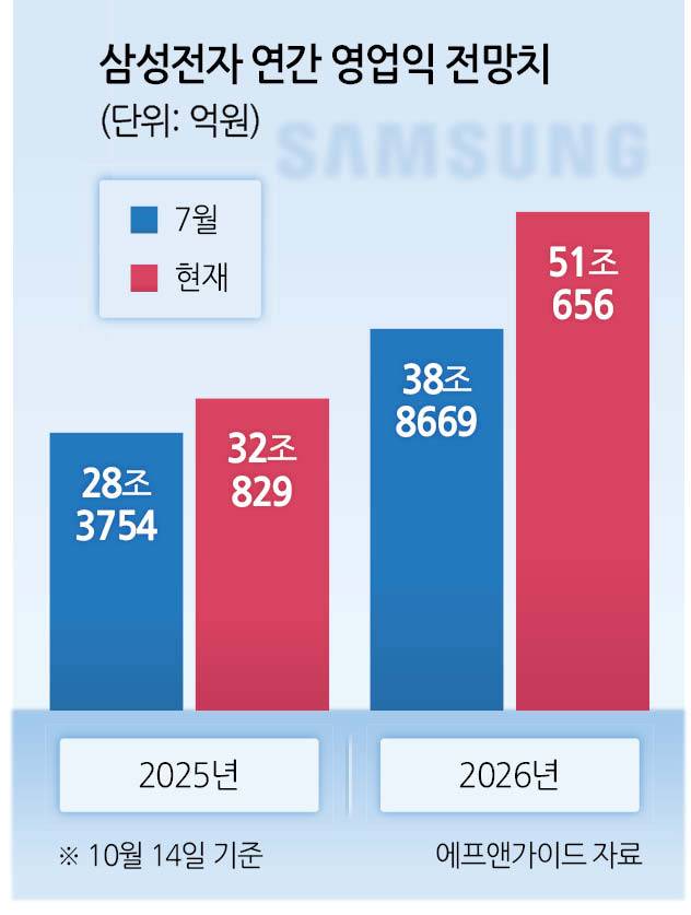 에프앤가이드가 집계한 국내 증권사들의 삼성전자 올해 연간 영업이익 전망치 컨센서스도 지난 7월 기준 28조3754억원에서 32조829억원으로 13.07%나 올랐다.
