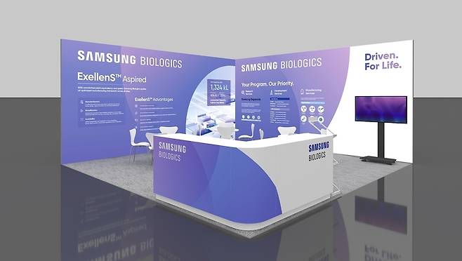 삼성바이오로직스는 전시장 부스 상단에 행잉 배너를, 하단에는 플로어 배너를 설치하고, 회사의 비전과 서비스 경쟁력에 대한 인지도를 높일 계획이다.