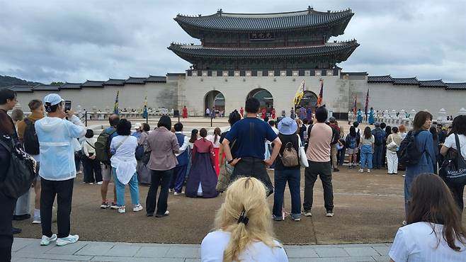 | ▲ 광화문 앞 월대에서 행해지는 수문장교대식을 참관하는 외국인들. |