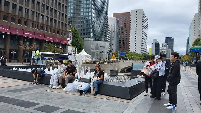 | ▲ 청계광장 '스프링' 조형물이 있는 곳에서 휴식을 취하는 외국인가족. |
