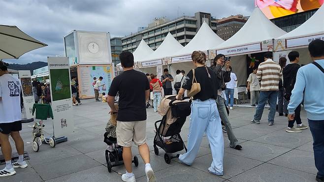 | ▲ 아이를 유모차에 태우고, 광활문광장 세종문화회관 앞 행사장을 찾은 외국인. |