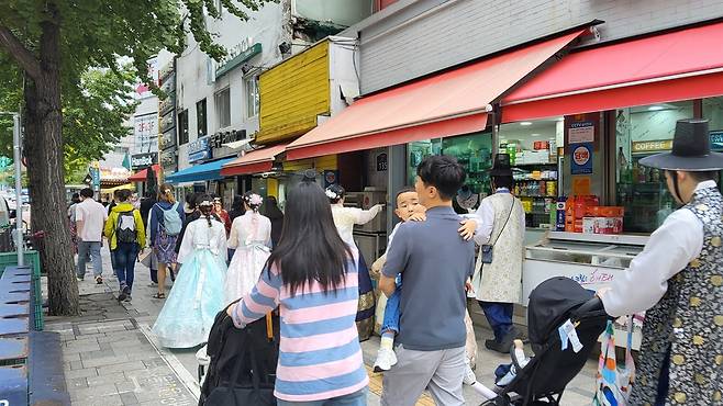 | ▲ 한복을 곱게 차려 입고, 환한 웃음을 지으며 서촌을 걷는 외국 관광객들. |