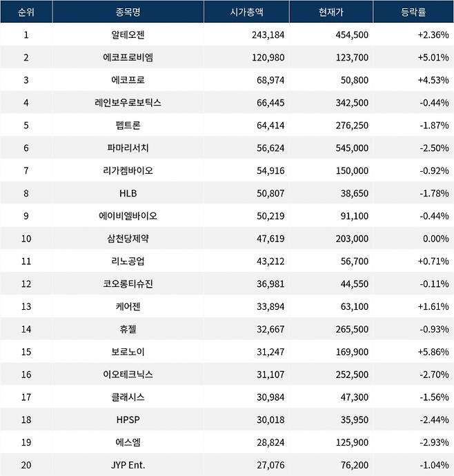 한편 시가총액 20위권 종목들은 리노공업(058470) ▲0.71%, 코오롱티슈진(950160) ▼0.11%, 케어젠(214370) ▲1.61%, 휴젤(145020) ▼0.93%, 보로노이 ▲5.86%, 이오테크닉스(039030) ▼2.70%, 클래시스(214150) ▼1.56%, HPSP(403870) ▼2.44%, 에스엠 ▼2.93%, JYP Ent.(035900) ▼1.04% 등의 성적을 기록하고 있다.