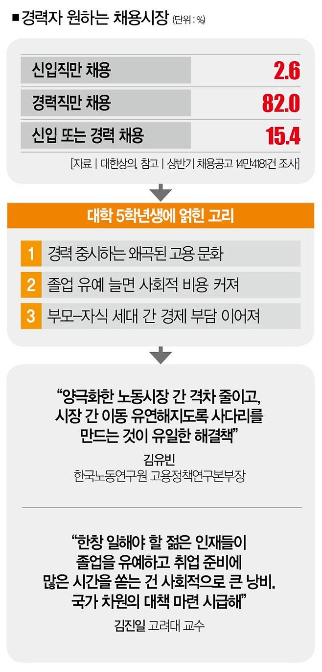 김진일 교수 역시 "한창 일해야 할 젊은 인재들이 졸업을 유예하고 취업 준비에 많은 시간을 쏟는 건 사회적으로 큰 낭비"라며 "노동시장 이중구조의 해소는 물론, 대학과 기업 간의 산학협력 강화, 채용 방식의 다변화와 같은 종합적인 대책을 하루빨리 마련해야 한다"고 말했다. 김 교수는 이어 "그 과정에서 신입 채용 시장에서 실질적인 기회를 제공할 수 있는 정책적 지원과 제도적 정비를 반드시 병행해야 한다"고 강조했다.
