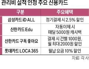 많은 카드가 관리비를 ‘실적 제외 항목’으로 분류한다. 하지만 꼼꼼히 찾아보면 관리비도 실적으로 인정하는 신용카드가 적지 않다. 삼성카드의 ‘iD ALL(아이디올)’은 아파트 관리비 정기 결제 시 2.5% 할인 혜택을 제공한다. 아파트 관리비, 이동통신요금, 주유비를 합산해 월 최대 1만원까지 할인받을 수 있다. 이후 결제 건에는 0.5% 기본 할인율이 적용된다. 예를 들어 관리비 20만원, 통신요금 10만원, 주유비 10만원을 납부하면 총 1만원의 혜택을 받을 수 있다. 전월 실적이 40만원 이상이면 최대 5000원, 70만원 이상이면 최대 1만원까지 할인받을 수 있다. 할인을 극대화하려면 매달 고정적으로 지출하는 아파트 관리비와 이동통신요금을 이 카드로 자동 결제하고 남은 금액을 주유비로 설정하는 것이 좋다.