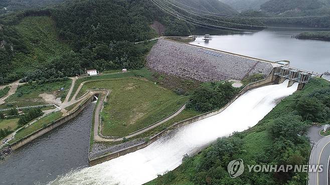 (강릉=연합뉴스) 유형재 기자 = 지난 9월 12일 저수율이 11.5%까지 떨어져 맨바닥을 드러냈던 강원 강릉시 주요 상수원인 오봉저수지가 14일 오후 4시 저수율 87.8%를 기록한 가운데 지난 7일 이후 방류가 계속되고 있다. 2025.10.14