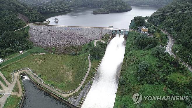 (강릉=연합뉴스) 유형재 기자 = 지난 9월 12일 저수율이 11.5%까지 떨어져 맨바닥을 드러냈던 강원 강릉시 주요 상수원인 오봉저수지가 14일 오후 4시 저수율 87.8%를 기록한 가운데 지난 7일 이후 방류가 계속되고 있다. 2025.10.14