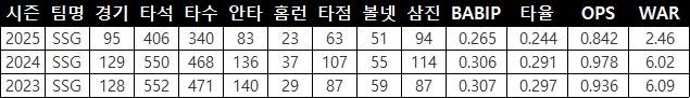그 결과, 2025시즌 최정은 총 95경기에 출장해 타율 0.244(340타수 83안타), 23홈런, 63타점, OPS 0.842에 그쳤다.
