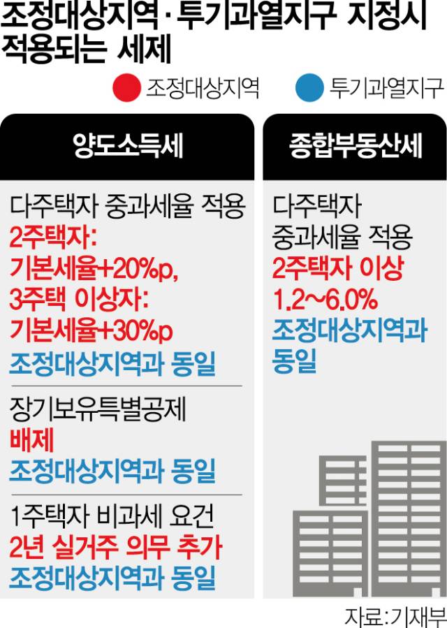 이번 대책에서 조정대상지역·투기과열지구 등 규제지역이 서울 전역과 경기 일부로 확대되고 추가 대출 규제 등이 포함되는 것도 이런 분석에 힘을 싣는다. 당초 서울 마포·성동·광진구 등 ‘한강벨트’와 경기 분당·과천 등 일부 지역만 규제지역으로 지정될 것으로 예상됐지만 서울 전역+알파(α)로 규제 범위가 확대될 가능성이 높다. 조정대상지역·투기과열지구 등으로 지정되면 현재 70%인 주택담보인정비율(LTV)이 40%로 강화되고 총부채상환비율(DTI) 역시 40%로 축소된다. 1주택자가 추가 주택 구입 시 취득세가 중과되고 청약·전매 조건 등이 강화된다. 현재 이 같은 규제지역은 서울 강남 3구(서초·강남·송파)와 용산구다. 조정대상지역·투기과열지구는 최근 3개월간 주택 가격 상승률이 소비자물가 상승률의 각각 1.3배, 1.5배를 초과할 경우 지정 가능한데 서울 대부분의 지역이 이 요건을 충족한 상황이다.