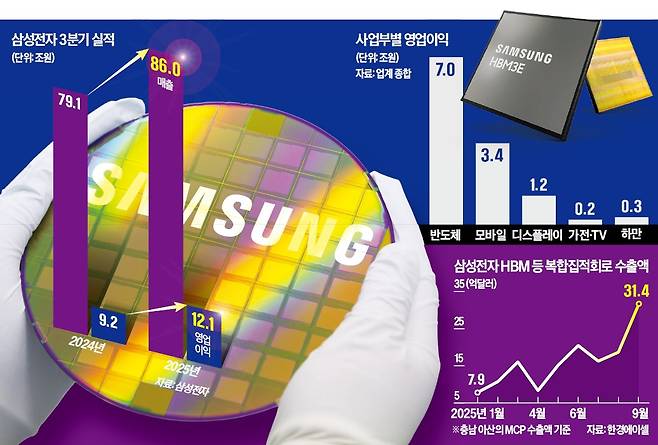 HBM사업의 성과는 수치로도 확인된다. 대체 데이터 플랫폼 한경에이셀(Aicel)에 따르면 지난달 삼성전자 HBM 생산 기지가 있는 아산의 복합구조칩집적회로(HBM 포함) 수출액은 31억4760만달러(약 4조5000억원)로 역대 최고를 기록했다. 지난 8월 수출액(18억7509만달러) 대비 67.9% 늘었다. AI 서버용 데이터 저장장치인 SSD도 효자로 부상했다. 한경에이셀에 따르면 삼성전자의 3분기 SSD 수출(아산 기준)은 18억6612만달러로 올 1분기(14억9178만달러), 2분기(17억7480만달러)에 이어 상승세를 이어갔다.