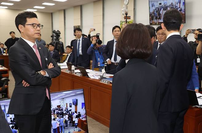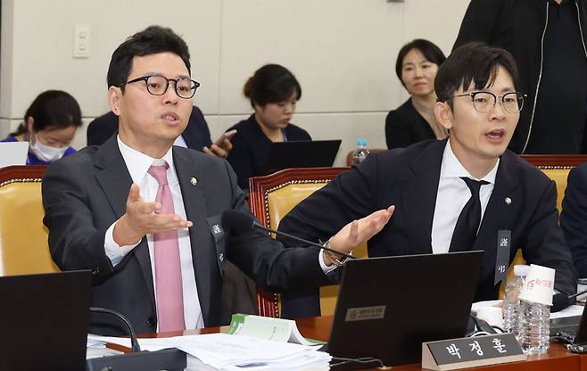 | ▲ 박정훈 국민의힘 의원(왼쪽)이 14일 오후 서울 여의도 국회 과학기술정보방송통신위원회에서 열린 국정감사에서 김우영 더불어민주당 의원에게 보낸 문자 메시지가 공개된 것에 항의하고 있다. |