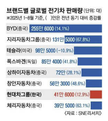올해 들어 8월까지 전 세계 전기차 시장이 30% 가까이 성장한 가운데 중국 업체인 BYD와 지리자동차가 거대한 자국 시장을 바탕으로 판매량 1, 2위를 차지했다. 미국 테슬라는 3위에 그쳤고, 현대차그룹은 7위를 유지하며 12.9% 성장했지만, 중국차 성장세 탓에 점유율은 다소 하락했다.