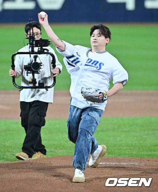 가수 우디가 삼성 라이온즈 승리 기원 시구를 하고 있다. 2025.10.14 / foto0307@osen.co.kr