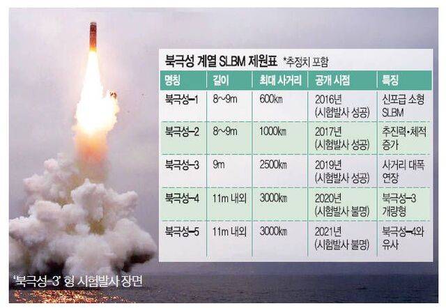 다만 전시회에서 신형 SLBM을 내세운 건 시험발사가 임박했다는 걸 과시하려는 전략적 메시지라는 평가가 나온다. 권용수 국방대학원 명예교수는 “전시회에서 SLBM을 공개했다는 건 발사 플랫폼인 중형 잠수함 건조가 가시화됐다는 뜻”이라고 말했다. 북한은 2016년 열병식에서 신포급 SLBM인 북극성-1을 처음 공개한 뒤 SLBM 개발에 열을 올려 왔다. 북한은 2017년 북극성-2, 2019년 북극성-3(추정 사거리 2500㎞)을 수중에서 시험발사하는 데 성공했다. 사거리 2500㎞는 북한 해역 어디서든 한국 전역을 타격할 수 있는 기준치로, 전술적 임계값으로 평가된다. 북극성-3의 개량형인 북극성-4·5는 전시회에서 공개됐으나 시험발사 여부는 확인되지 않았다.