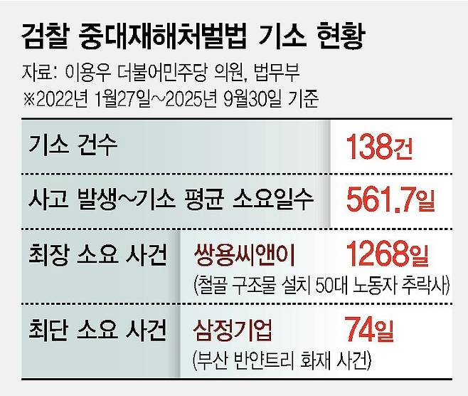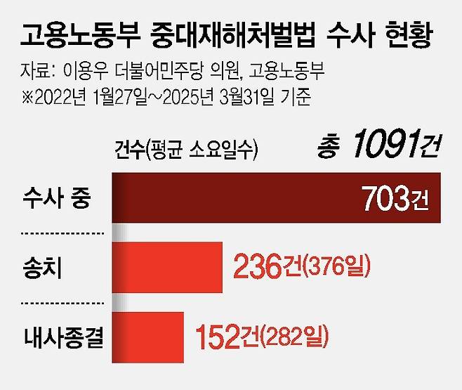 이용우 더불어민주당 의원이 고용노동부에서 받은 자료를 보면, 지난 3월 말까지 중대재해처벌법(중처법) 위반 혐의로 노동부가 수사에 착수한 사건 1091건 중 1천일 넘겨 '수사 중'인 사건은 58건에 이른다.