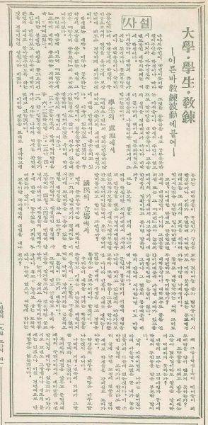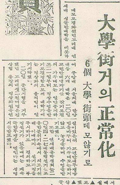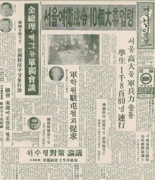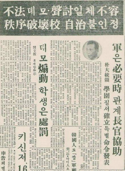 10월 16일 본보 1면 기사에는 '불법 데모·성토 일체 불용/질서파괴교(校) 자치불인정' 제하의 기사에서 학원질서 확립 특별명령(위수령)을 발표했다. 17일자에는 '서울에 위수령·10개교 휴업령'을 내리고 서울·연대 등 군병력이 출동해 학생 1889명을 연행했다고 보도하고 있다.