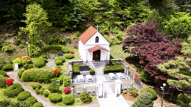 성당 안 작은 창문을 통해 소나무 숲이 보인다. 성당 앞에 나오니 단풍나무가 우거졌다. 단풍 든 가을이 얼마나 아름다운 풍경일지 짐작이 된다. 창문으로 보이던 아름드리 소나무들은 성당 주변을 포근히 감싸고 있다.
