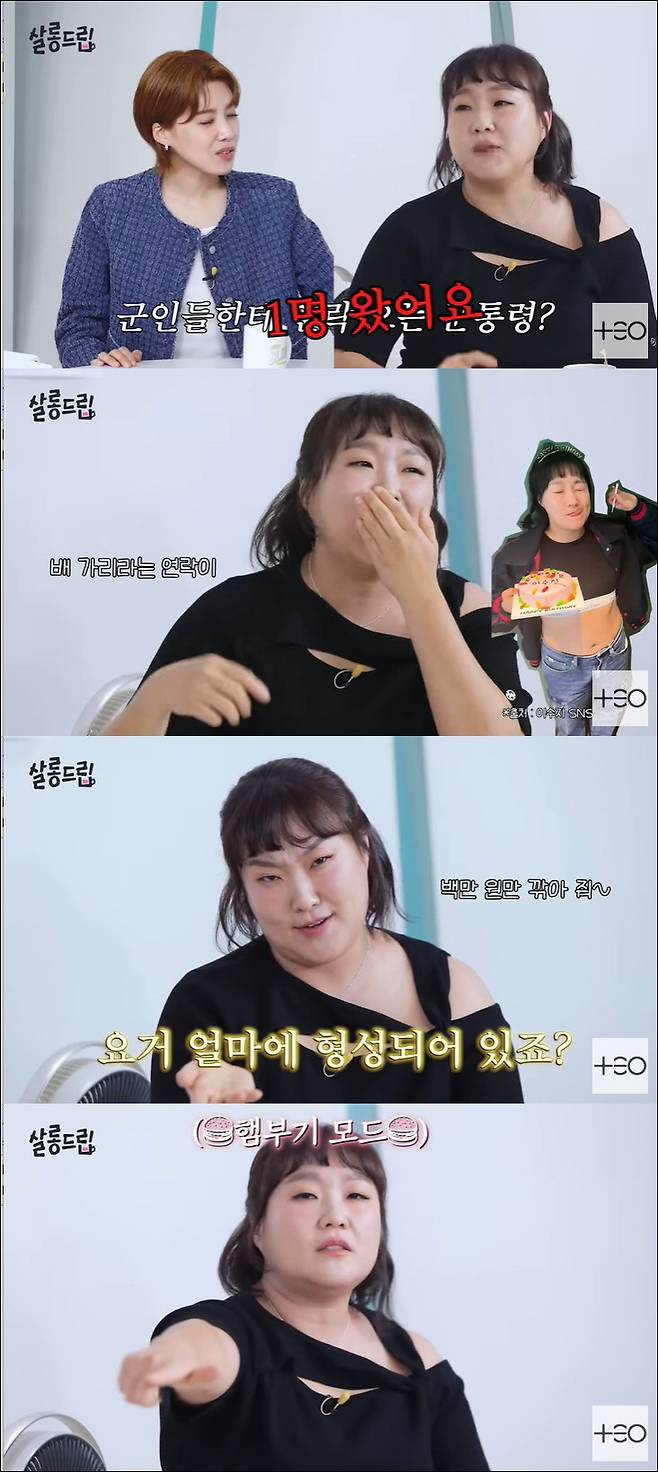 장도연은 이수지에게 "인기 비결이 노출이라더라. '군통령'이라고 DM이라고 쏟아진다더라"라고 물었지만 이수지는 "한 명 왔다"고 밝혀 웃음을 안겼다. 이수지는 "한 명 왔고 배 가리라는 연락이 한 100개 왔다. 그래서 반항한 거다. '에라 모르겠다' 한 거다"며 그 이후 더욱 노출을 하게 됐다고 밝혔다.