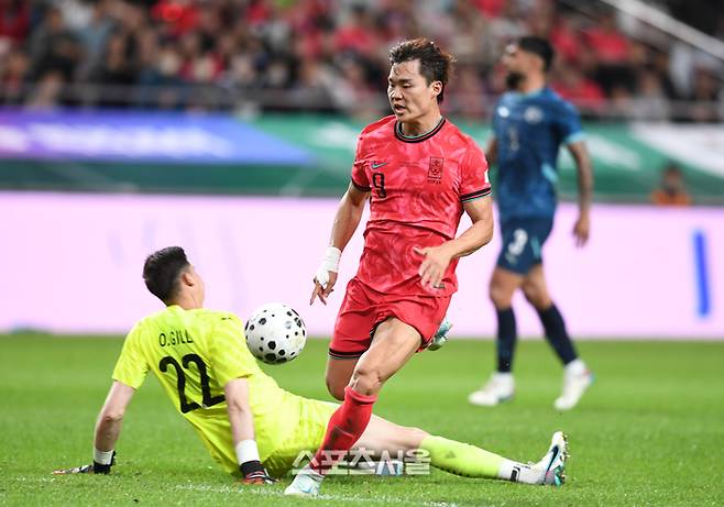 한국은 후반 9분 김문환이 페널티박스 오른쪽에서 공격에 가담한 조유민을 향해 넣은 공이 김진규를 거쳐 골문 앞 엄지성에게 전달됐다. 그가 재빠르게 오른발 슛했으나 임팩트가 약했다. 골키퍼에게 잡혔다.