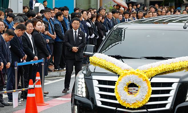 | 양평군청서 영결식 14일 경기 양평군청에서 열린 50대 사무관급 공무원 정모씨 영결식에서 운구차가 이동하는 가운데 공무원들이 추모 묵념을 하고 있다. 정씨는 양평 공흥개발지구 특혜 의혹과 관련해 김건희 특별검사팀 조사를 받은 후 숨졌다. 양평=뉴스1 |