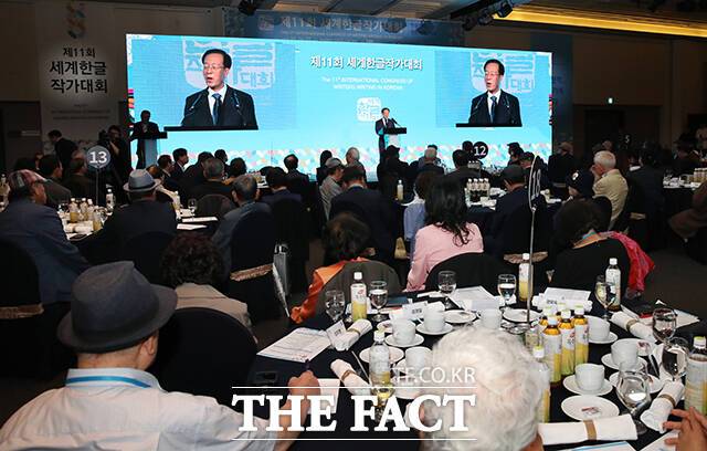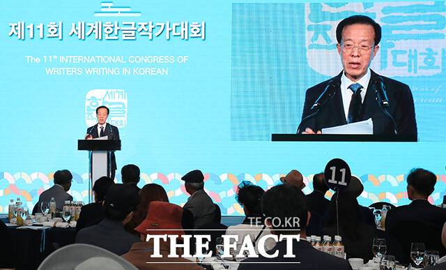 [더팩트ㅣ임영무 기자] 이석연 국민통합위원장이 14일 오후 서울 서대문구 연세대학교에서 열린 제11회 세계한글작가대회에 참석해 축사를 하고 있다.