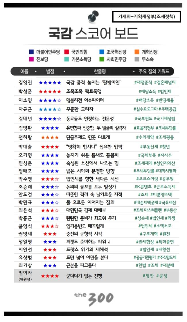 한편 머니투데이 더300(the300) 국감 스코어보드의 평가 기준은 △정책 전문성 △이슈 파이팅 △국감 준비도 △독창성 △국감 매너 등이다.